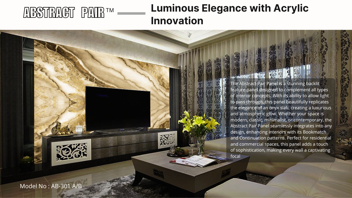 Introducing the Abstract Pair Panel, a sophisticated backlit panel designed to bring a luminous, high-end aesthetic to feature walls. Crafted to allow light to pass through, this panel beautifully mimics the luxurious look of an onyx slab, creating a warm and elegant ambiance. Featuring Bookmatch and Continuation patterns, it ensures a seamless and visually striking design, adding depth and harmony to any space.