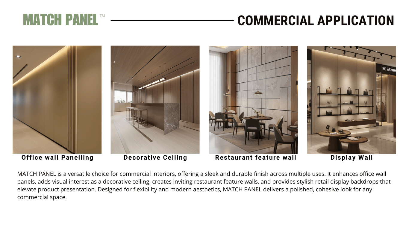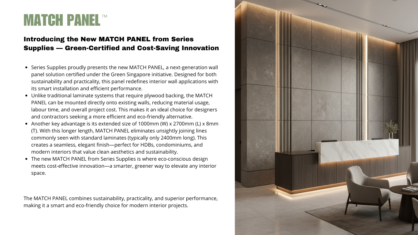 Introducing Match Panel, designed to seamlessly pair with our Series Supplies Fluted Wall Panels for a cohesive and elegant interior finish. Measuring Width 1000mm x Length 2700mm x Thickness 8mm, this panel is crafted for effortless integration, ensuring a flawless transition between surfaces while enhancing the overall aesthetic of any space.